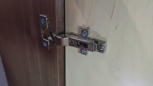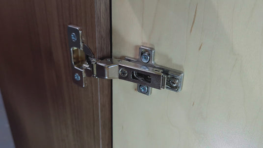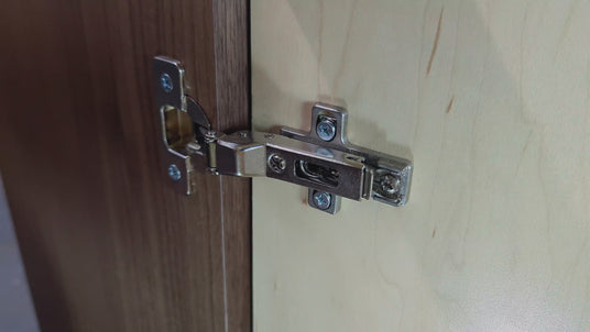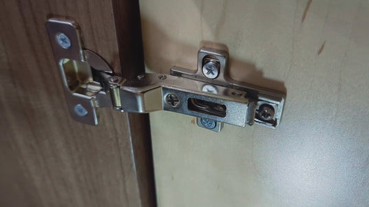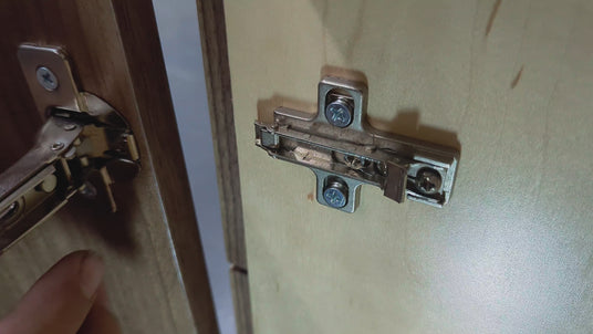 Line up the front hooks of the hinge to the metal dowels on the front of the mounting plate. Press firmly on the back of the hinge to snap it in place.