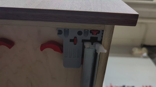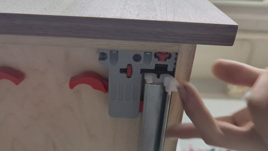 Line up the drawer box on the two drawer slide rails. Pull each slide rail forward until you hear it click into the drawer clips. Do that for both left and right slide rails.