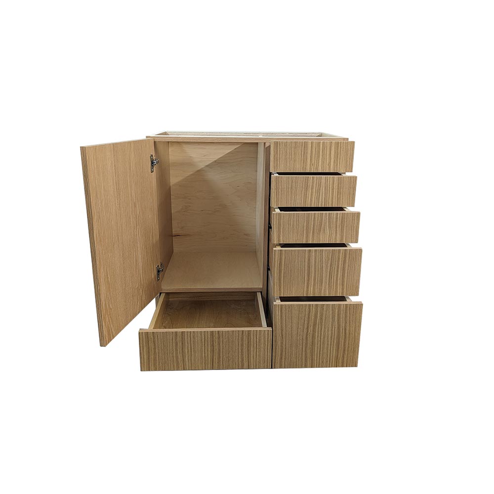 This beautifully crafted rift white oak is constructed from the highest quality plywood coated in sequence matched white oak veneer providing a very uniform, consistent look! With six soft close, full extension drawers, this compact vanity offers tons of storage with a small foot print. The "raw" effect finish keeps the colors of this white oak vanity as close to the natural tones as possible.