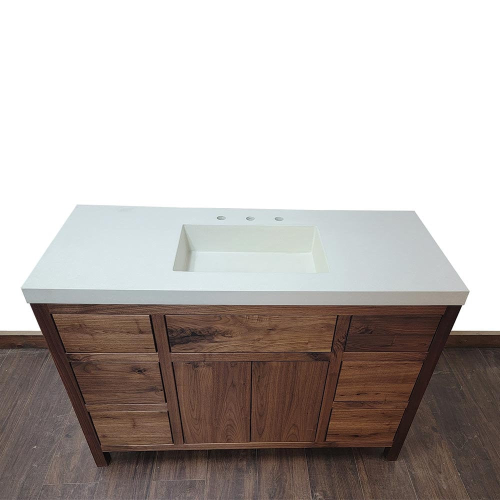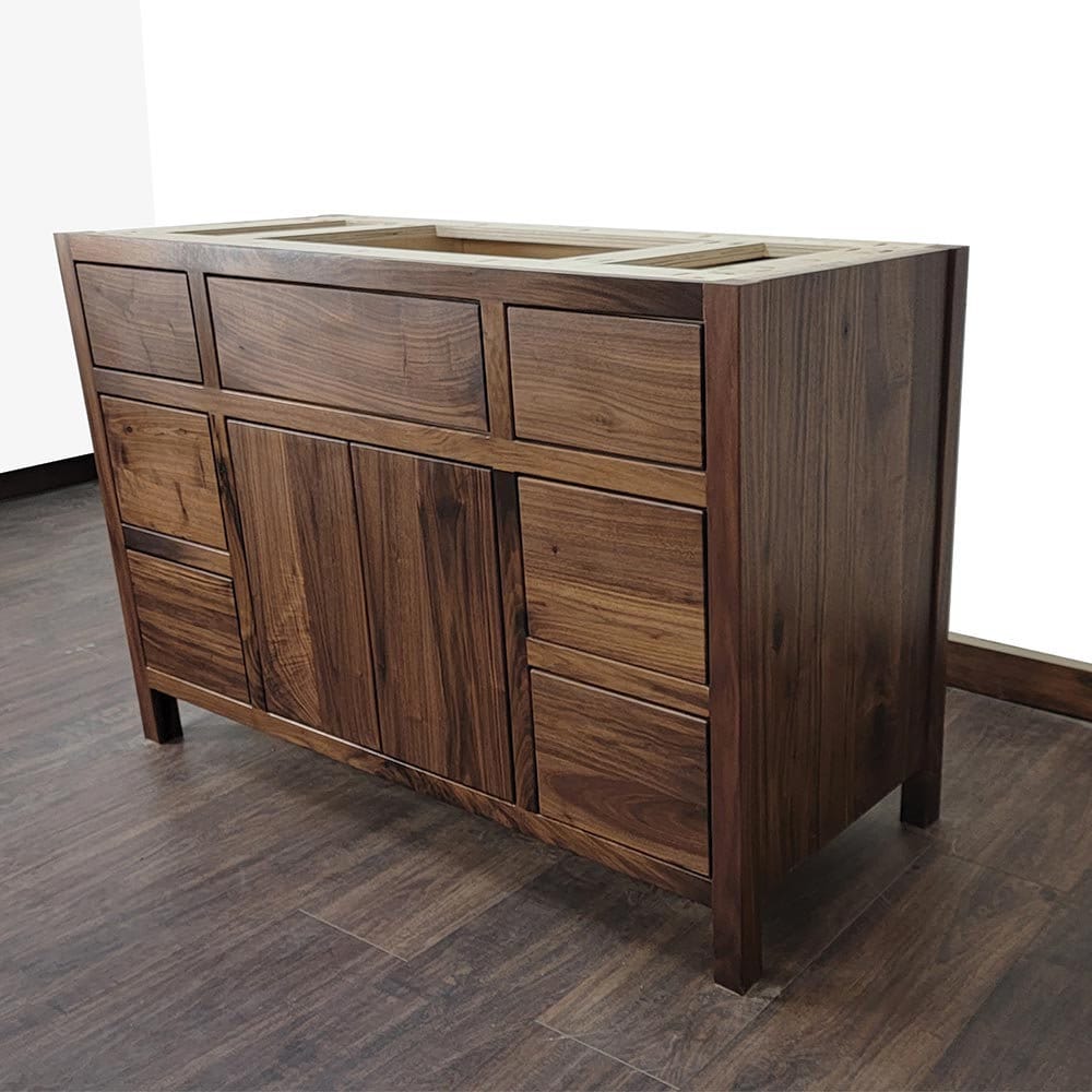 Our beautiful rustic walnut vanities bring a warm feel to your home. This spacious design offers plenty of storage for all your personal care items. The rustic walnut hardwood has plenty of character and grain that is sure to catch the eye. Our eco friendly finish helps protect the environment while offering a water resistant surface for your family. Each of our vanities are made one at a time, so you know you’re always getting something made with care.