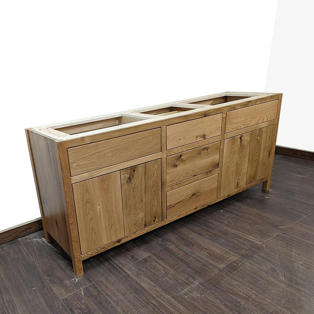 Our beautiful rustic white oak vanities bring a warm feel to your home. This spacious design offers plenty of storage for all your personal care items. The rustic white oak hardwood has plenty of character and grain that is sure to catch the eye. Our eco friendly finish helps protect the environment while offering a water resistant surface for your family. Each of our vanities are made one at a time, so you know you’re always getting something made with care.